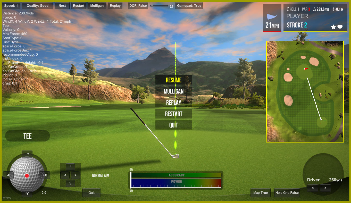 The Directional pad controls the camera rotation (aim), camera position, and ball impact position. So, I needed a method for switching between those controls/options. I came up with a simple solution where a yellow outline/highlight appears around the activated control. A text label also appears informing the player which control is selected. I hope this is sufficient, works great for me, but not sure how other players will like it.